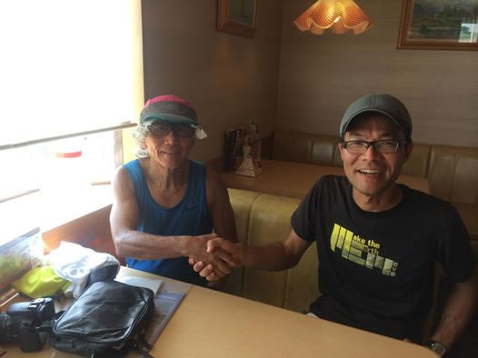 20キロ地点、千葉県香取市小見川のjoyfulでランチ中。スタートから、1000キロ応援隊千葉県支部長の若井さんが伴走してくれました。ナビでルートを確認したり、後方の車を気配りしたり、フル活躍でした。若井さん、暑い中ホントありがとう!
