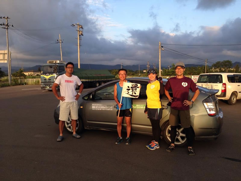 スタートは5時50分。田村市船引の菅谷小学校前をスタート、17時55分飯舘村の農協飯舘本所前にゴール。 前日に続き、海野さんと西原さんが運転と伴走をサポート。海野さんの健脚ぶりが光った。西原さんは先回りしてルートを細かくチェックするなど身体に似合わず前日夕方から「チョビチョビ」と事細かに動き休憩ポイント等の交渉もしてくれた。 沿道では朝7時にもかかわらず町の商店のご夫婦が店に招き入れてくださり「お茶っこ」を頂いたり、走るのを目にした男性が後ろから追い掛けてきて握手を交わしたりした。
